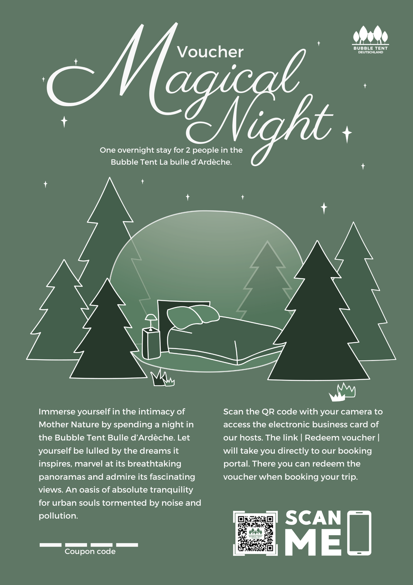 Gift Voucher - Week-Long Stay at the Bulle d'Ardèche Treat yourself to a unique getaway in the heart of nature with our gift voucher, exclusively valid for week-long stays at the Bulle d'Ardèche. Perfect if you're looking to avoid the weekend crowds, this voucher allows you to enjoy a moment of tranquility in an exceptional setting. Immerse yourself in the serenity of the Ardèche and let yourself be charmed by its picturesque landscapes and soothing calm.
